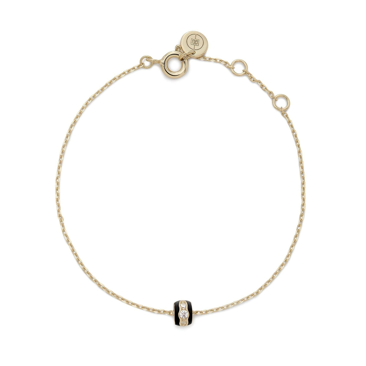 Add modern flair with the Black Enamel & CZ Channel Rondelle Bracelet. Recycled 925 Silver, 14K Gold Plated + ecoat or 14K Gold Vermeil, 6"+1" extender, adorned with sparkling CZs and a chic black enamel rondelle.
