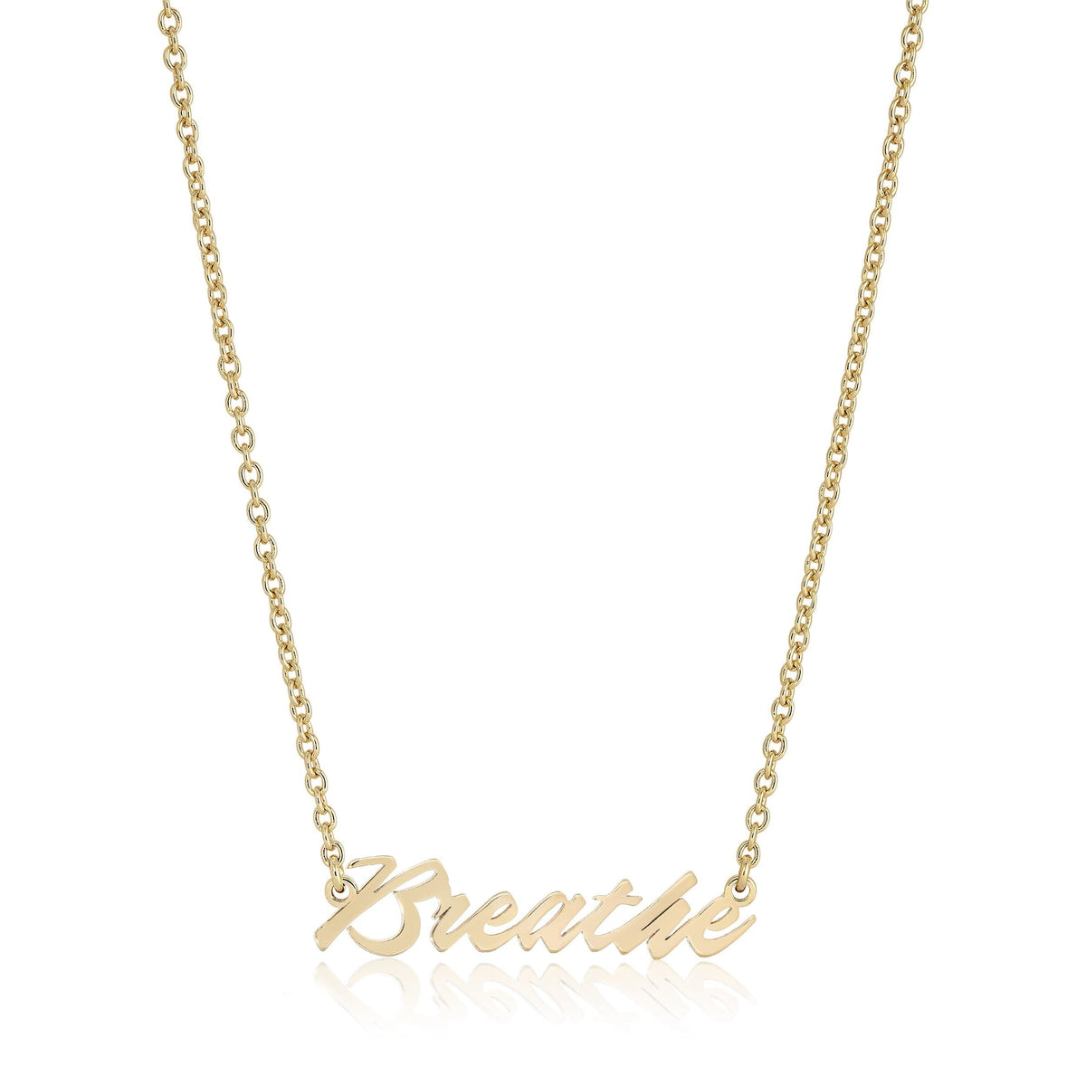 Mindful Luxury, Everyday Reminder—the Breathe Necklace is crafted from recycled brass, plated in 14K gold or rhodium. The elegant script measures 12mm wide, 48mm long, and rests on an adjustable chain (16"–20").