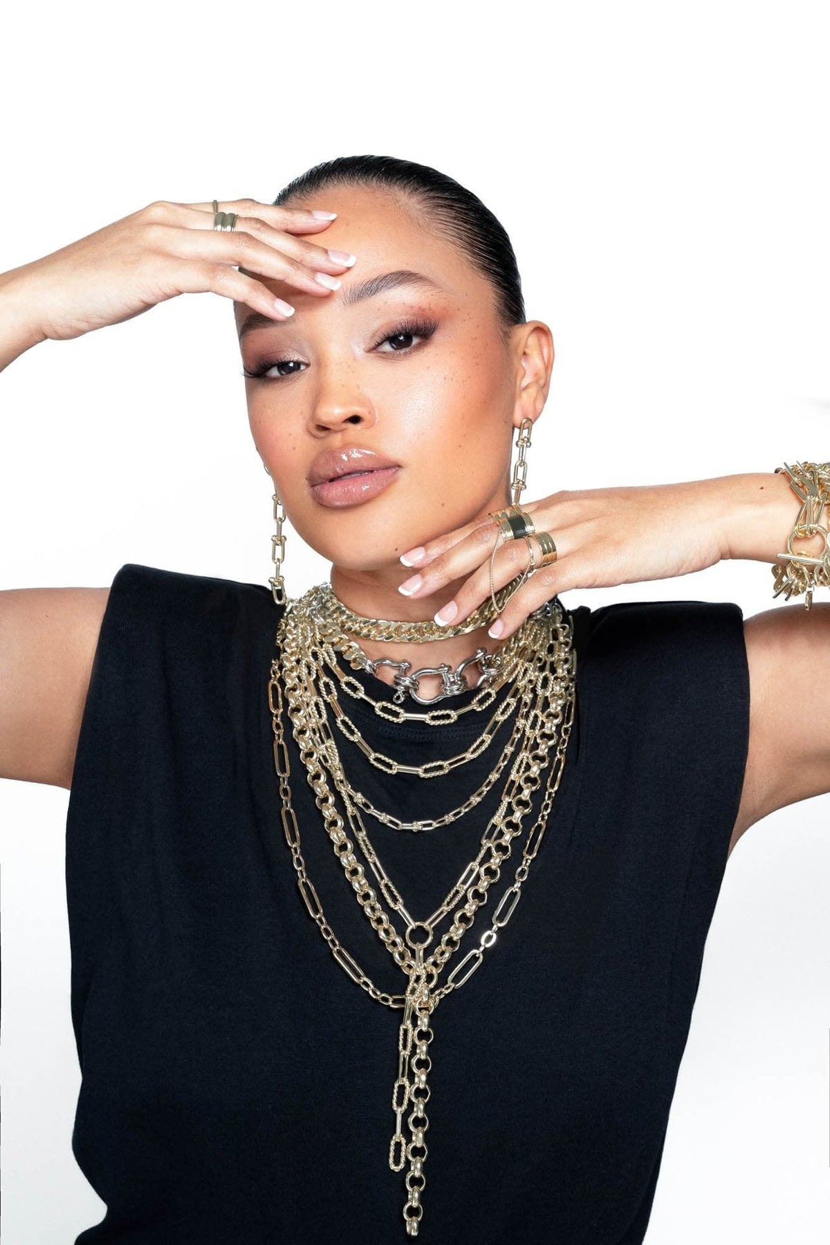 The Dean Lariat features a bold and eye-catching multi-link design, secured elegantly with a lobster clasp. This fashion-forward and versatile piece is artfully highlighted by the model, who pairs it with other chains and lariats to create an impactful style statement. As a standalone piece, this gold Y necklace makes a striking statement.