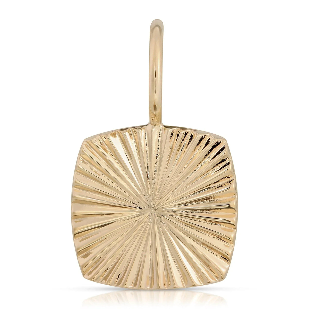 Shine bright with the Diana Charm. This square pendant, crafted from recycled brass and plated in 14K gold, features an intricate sunburst design for a standout statement.