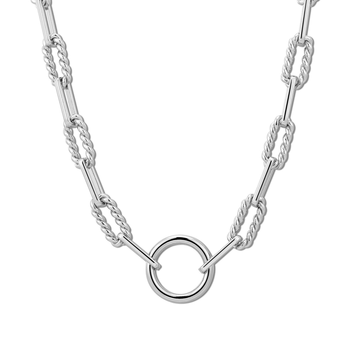 The Eliza necklace is a captivating creation that beautifully blends elegance with innovative design. Its standout feature is an exquisite alternating twisted link chain, elegantly highlighted by a stunning large accent ring and securely closed with a robust lobster clasp.