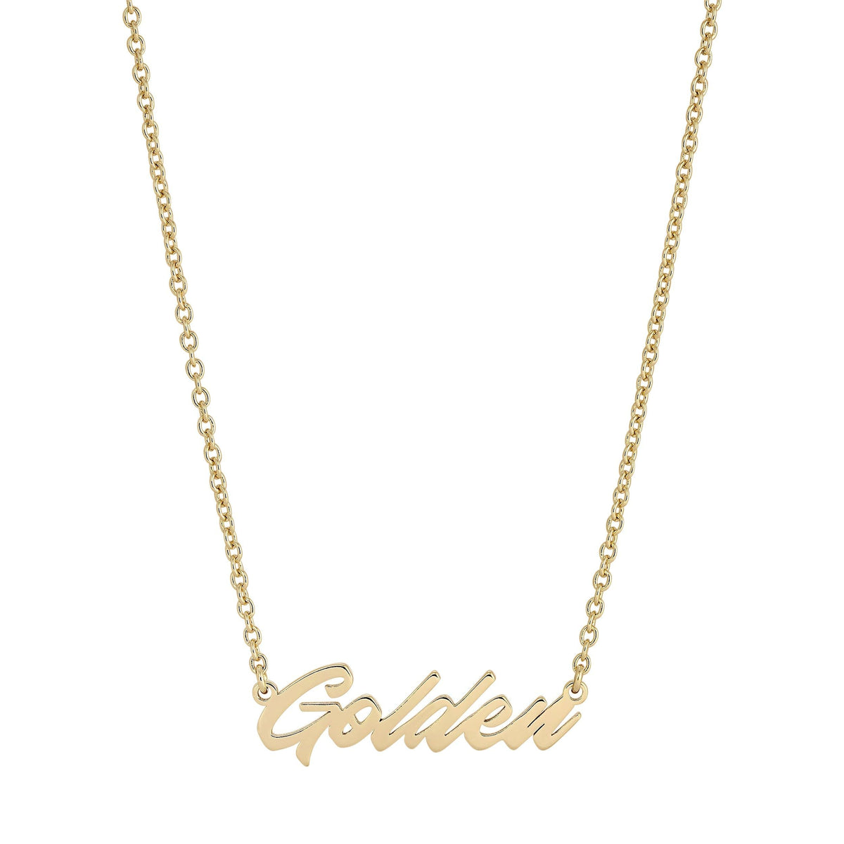 Radiant Positivity, Ethical Shine—the Golden Necklace is made from recycled brass, finished in 14K gold or rhodium for a luminous, adjustable look (16"–20"). The signature “Golden” script measures 12mm wide, 1.4" long.
