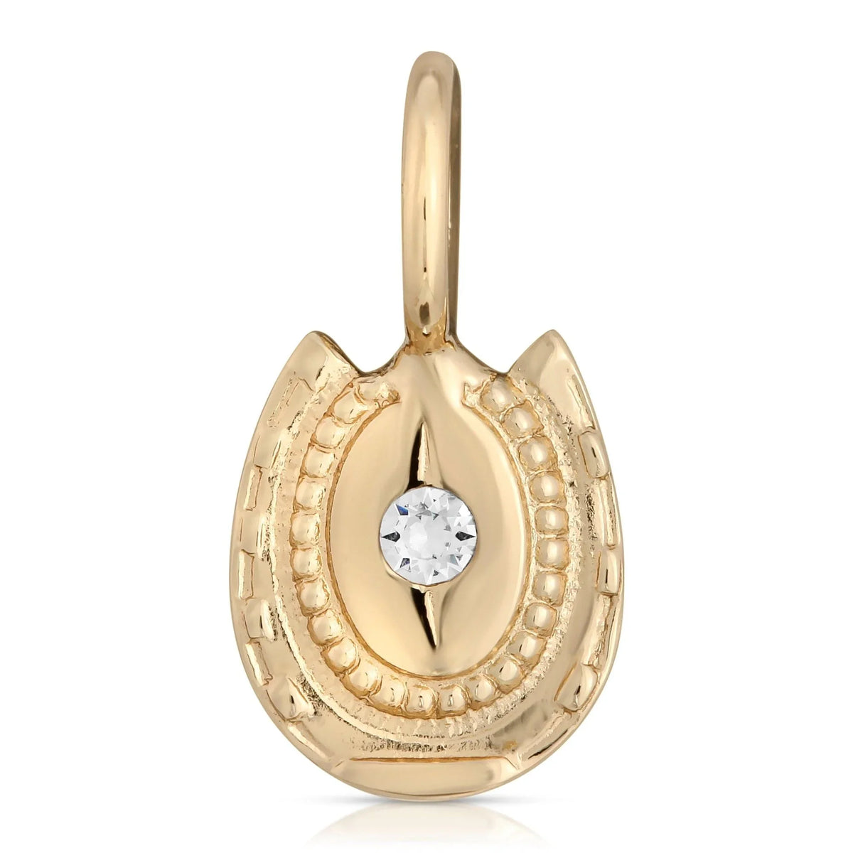 Attract good vibes with the Harlow Charm. This horseshoe-shaped pendant, crafted from recycled brass and plated in 14K gold, features a sparkling Swarovski Crystal for a touch of brilliance.