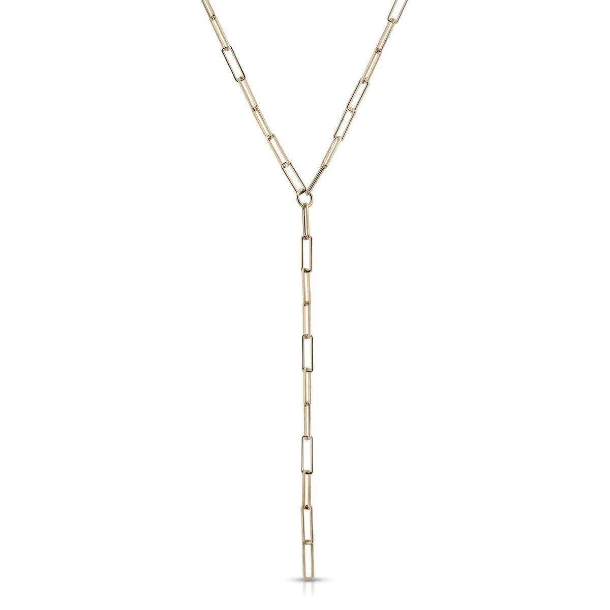 Make a Lasting Impression with the Large Rectangle Link Lariat (Y Necklace), expertly handcrafted from recycled brass and plated in dazzling 14K gold. Oversized links (5.4mm x 18mm) and a dramatic 6.5" drop deliver a bold statement for any occasion.