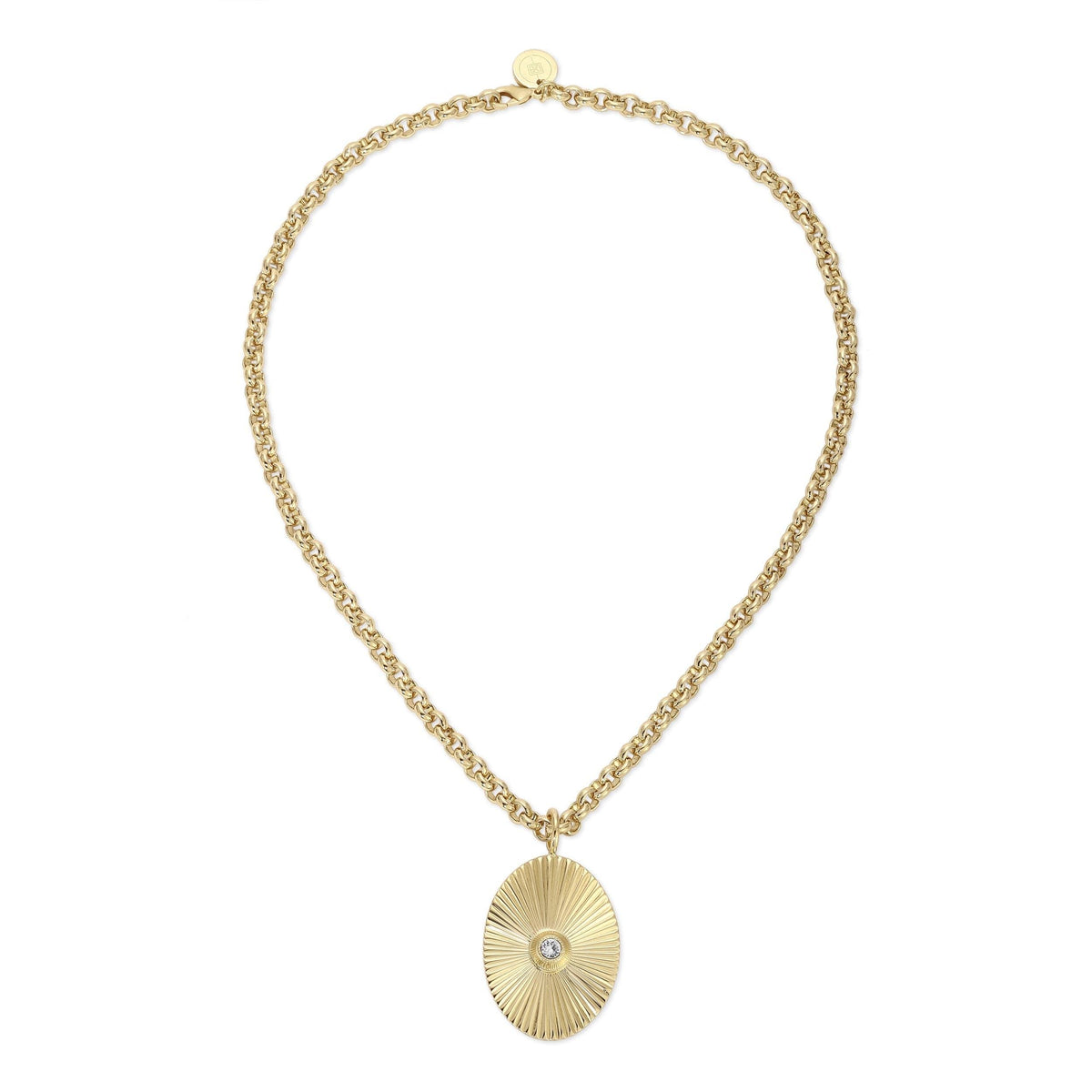 Experience the perfect blend of elegance and eco-friendliness with our exquisite Oval Starburst Pendant. This breathtaking piece is crafted from recycled brass and features a dazzling Swarovski Crystal Center that enhances its allure.