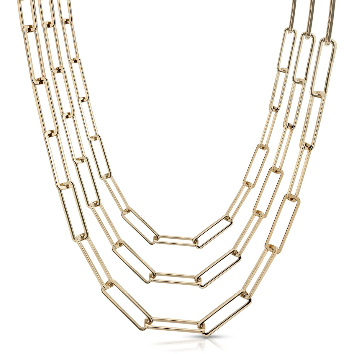 Bold Layers, Timeless Appeal—the Triple Large Rectangle Link Chain Necklace is a show-stopping statement piece crafted from recycled brass. Featuring oversized links (5.4mm x 18mm) and finished in both 14K gold and rhodium, its three perfectly layered chains (16", 18", 20") radiate confidence and elegance.